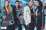 The top left photo is by H&M and is advertising there brand. The photo features 5 models in the centre as focus, 2 males and 3 females The photo mostly follows a monochrome colour scheme which uses black and white as the main colours. This creates an eye pleasing aesthetic which makes the audience engage with the photo more.All if the models in this photo are famous and the target audience will easily recognise them from. The females From left to right, Gigi Hadid, Jourdan Dunn and Kendall Jenner are well known with a huge following. The photo is apart of the Balmain x H&M line.